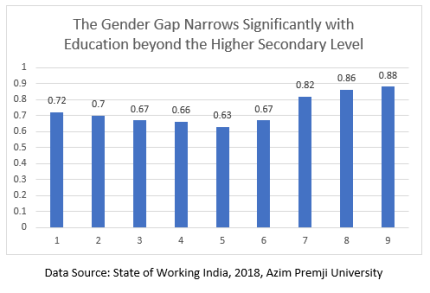 Sexual division of labor is a normative behavior which is a characteristic children, especially a girl child, are grown up with and termed as a fact of life. The kind of education which the girl child gets depends on the future expectations from her. In the graph below, it is shown that the least gender earnings gap is at Secondary level education (0.63%). This can be used to conclude the fact that the female gender is stigmatized into believing that their earnings are not as important as her husband. This results in the women not being sent to technical degree colleges which could result in a high paying job. Even if women have a master’s degree, the earnings gap is massive (0.88%). Women continue to be heavily under-represented among senior officers, legislators and managers (State of Working India, pg. 121) as they are considered to be ‘better-suited’ for homemaking and other unpaid labor.